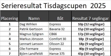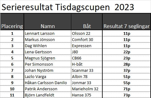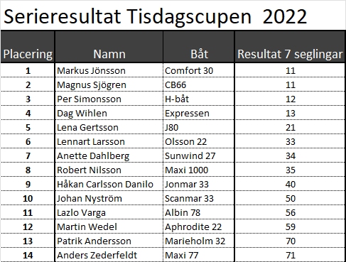 Tisdagscupen 2021, 13 seglingar. | ||||